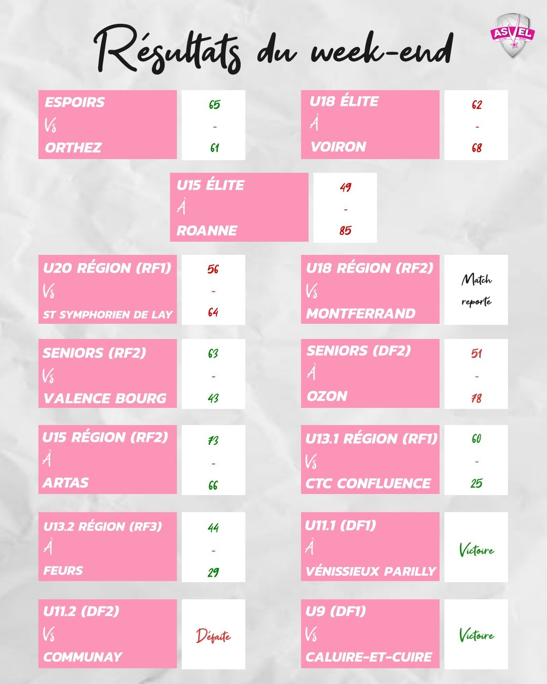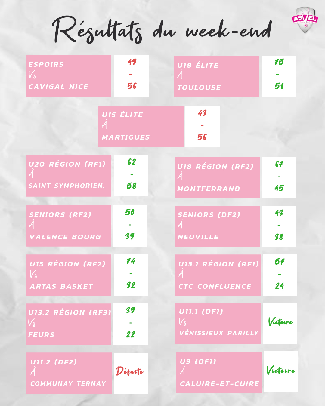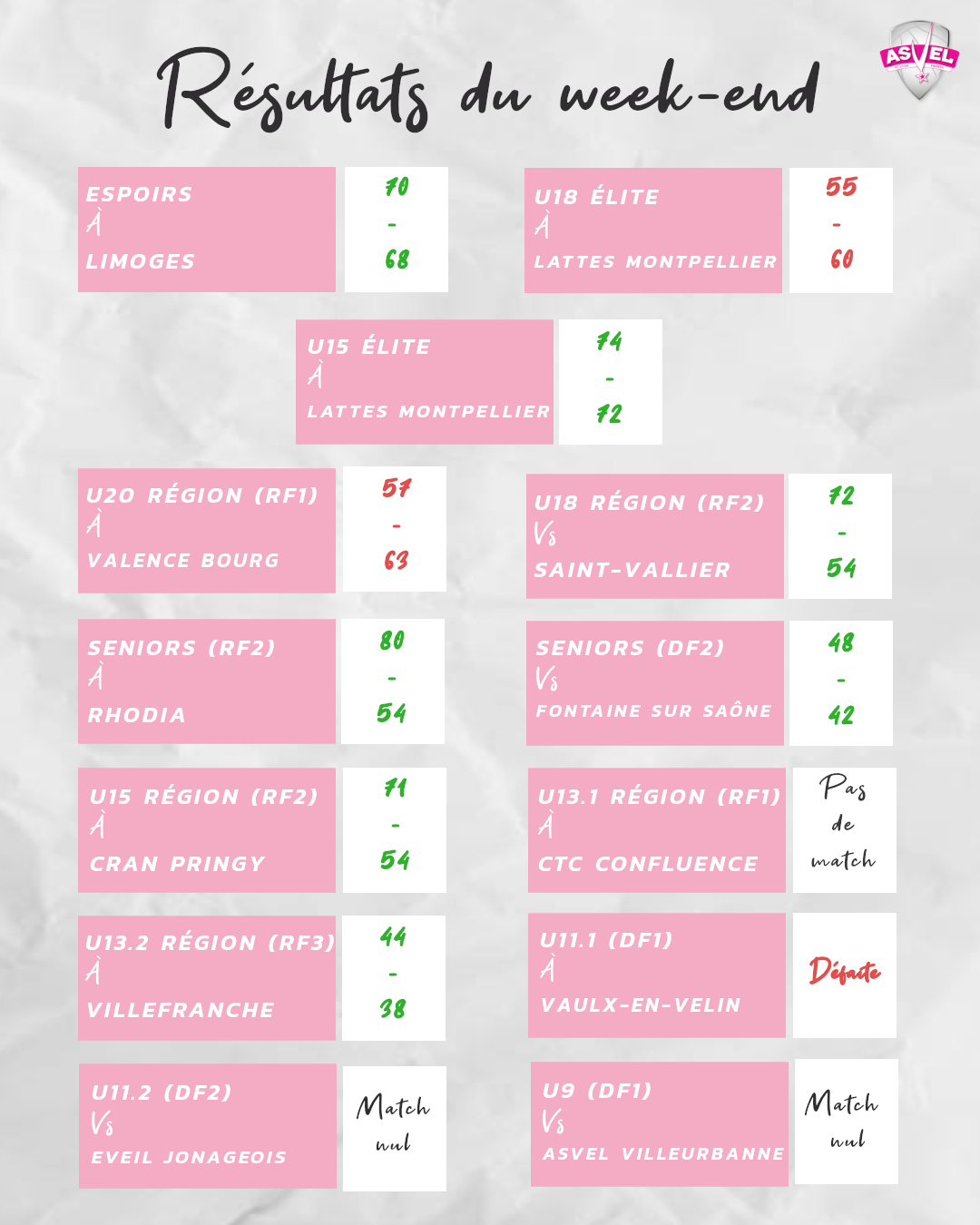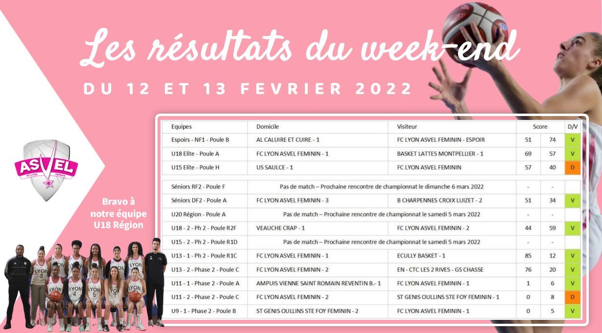 Tous les lundis, retrouvez l'ensemble des résultats du week-end et pour toutes les équipes du FC Lyon ASVEL Féminin avec les commentaires éventuels. Pour retrouver tous les résultats, cliquez sur les dates des week-end correspondant à votre recherche :